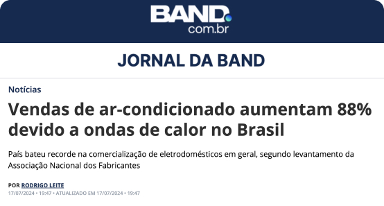 As vendas de ar-condicionado aumentaram 88% devido às recentes ondas de calor no Brasil, demonstrando uma demanda crescente por conforto térmico.
